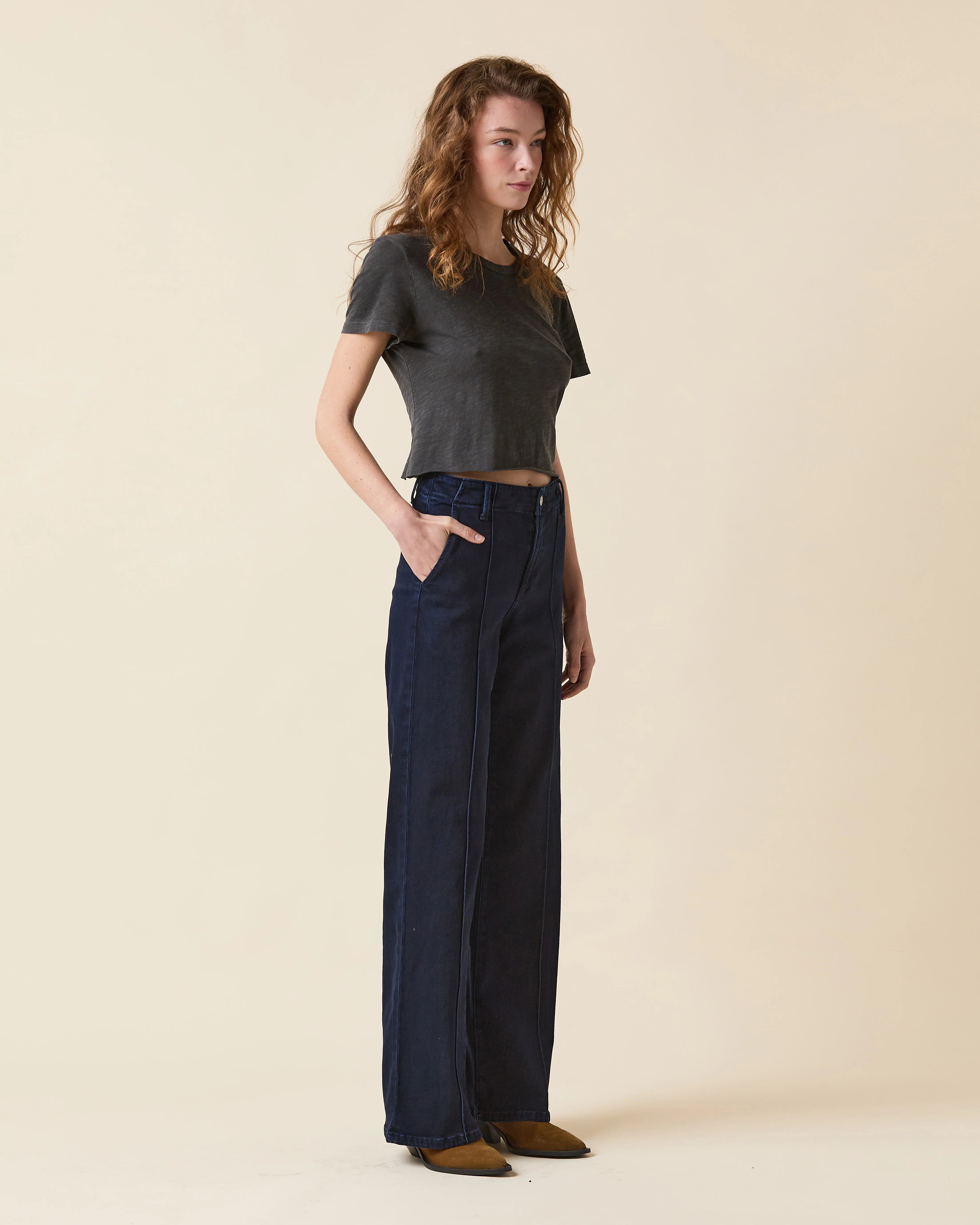 A sleek update to your everyday denim, this deep-navy trouser jean features front seams that elongate the leg for a polished, tailored look. Crafted with a soft stretch fit, it combines comfort with structure—perfect for dressing up or down. Pair it with a fitted tee and boots for an effortlessly elevated outfit.