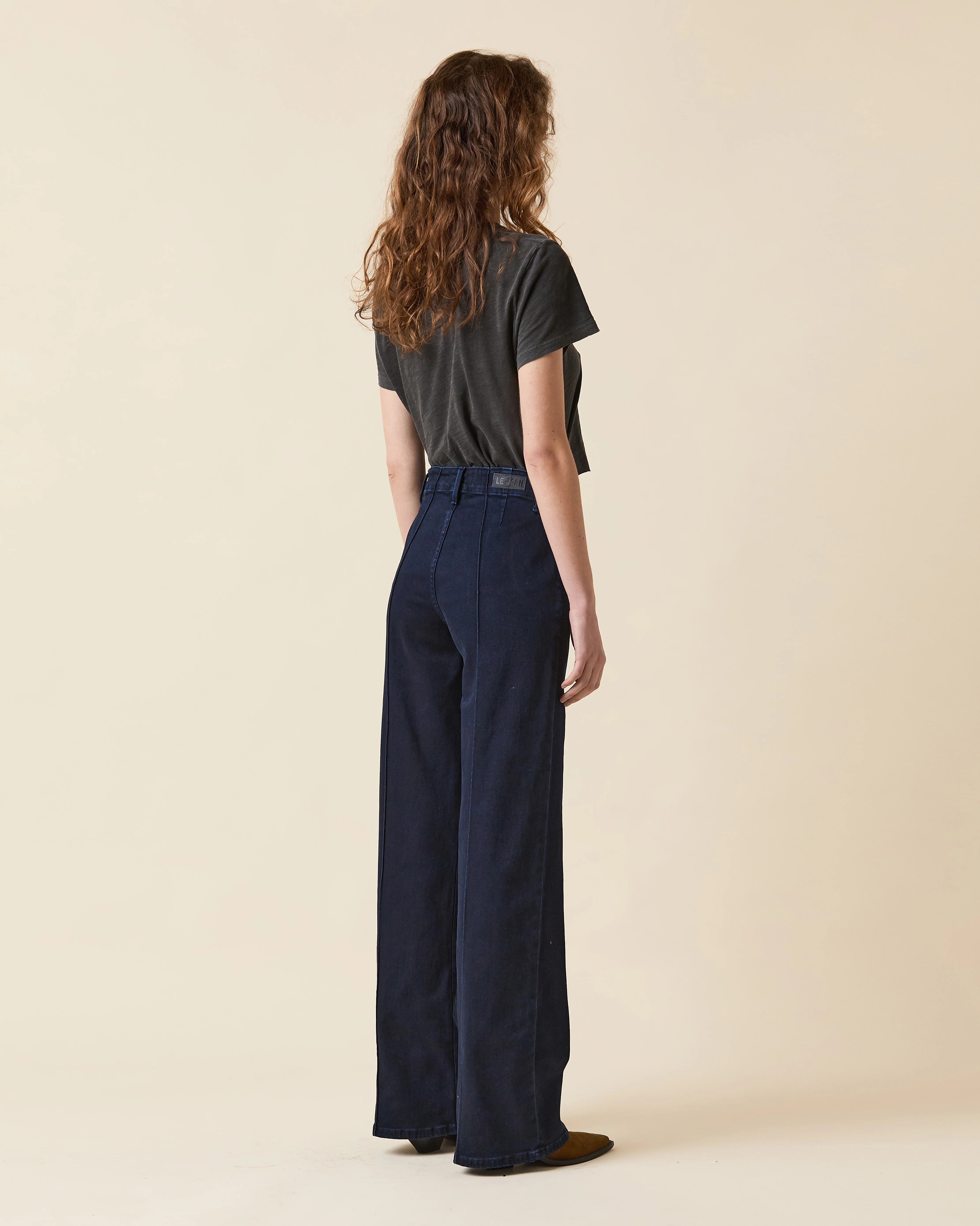 • A sleek update to your everyday denim, this deep-navy trouser jean features front seams that elongate the leg for a polished, tailored look. Crafted with a soft stretch fit, it combines comfort with structure—perfect for dressing up or down. Pair it with a fitted tee and boots for an effortlessly elevated outfit.