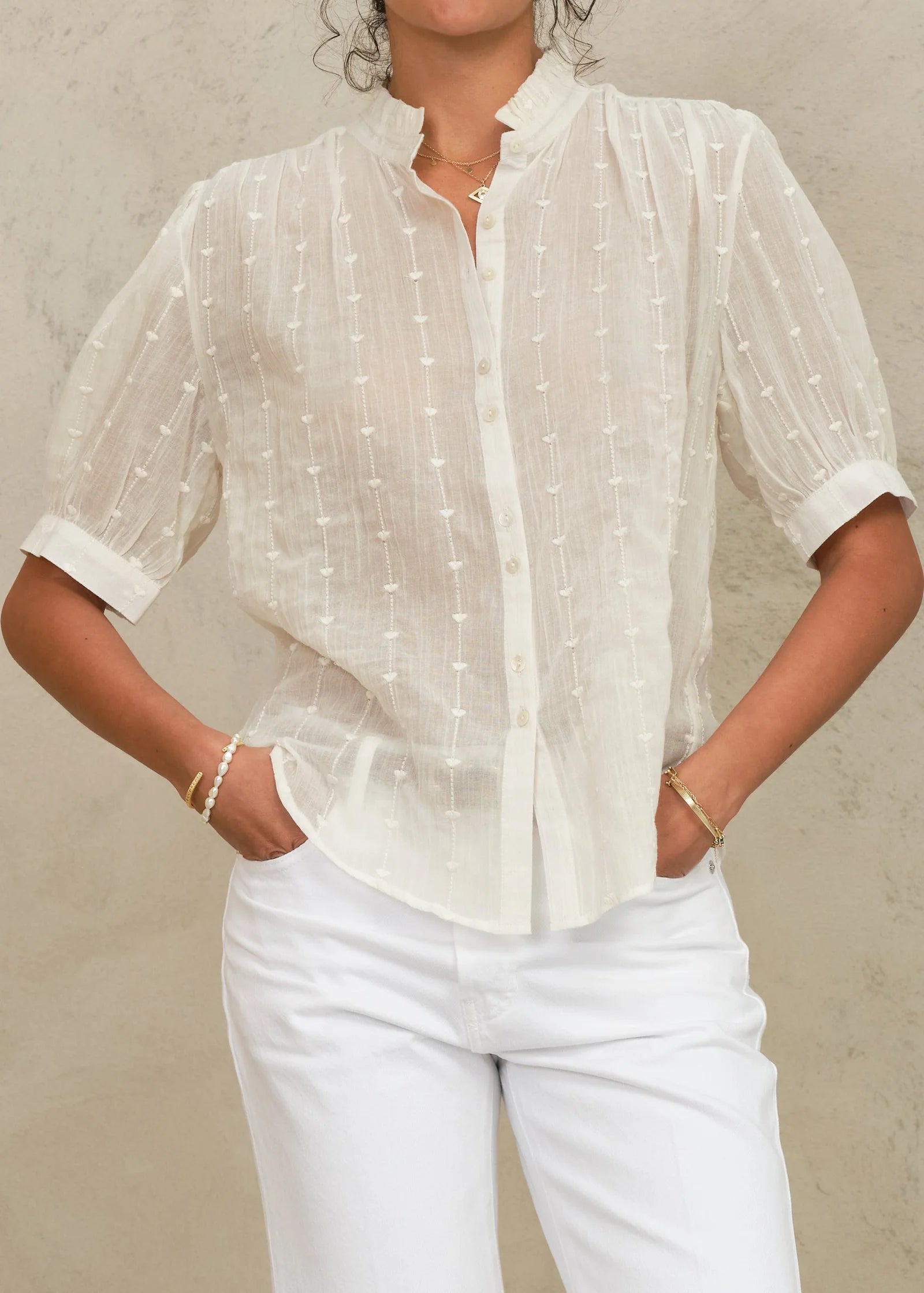 Light, airy, and effortlessly refined, this sheer blouse features delicate textured detailing and a soft, feminine silhouette. The subtle structure and button-front design make it perfect for both polished and relaxed styling. Pair it with tailored pants or denim for an elevated everyday look.