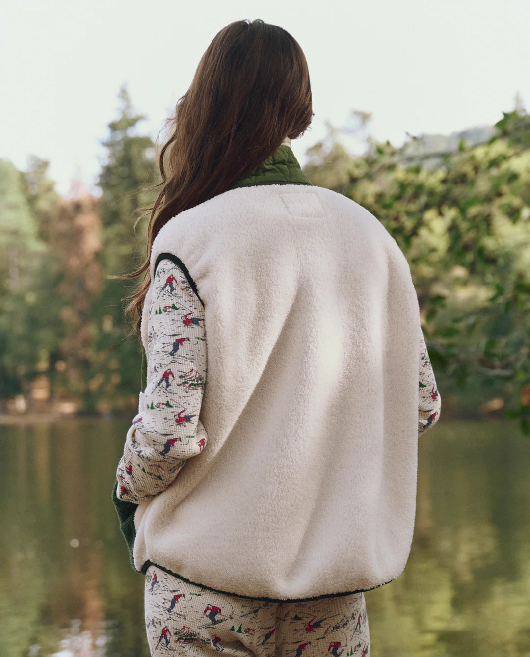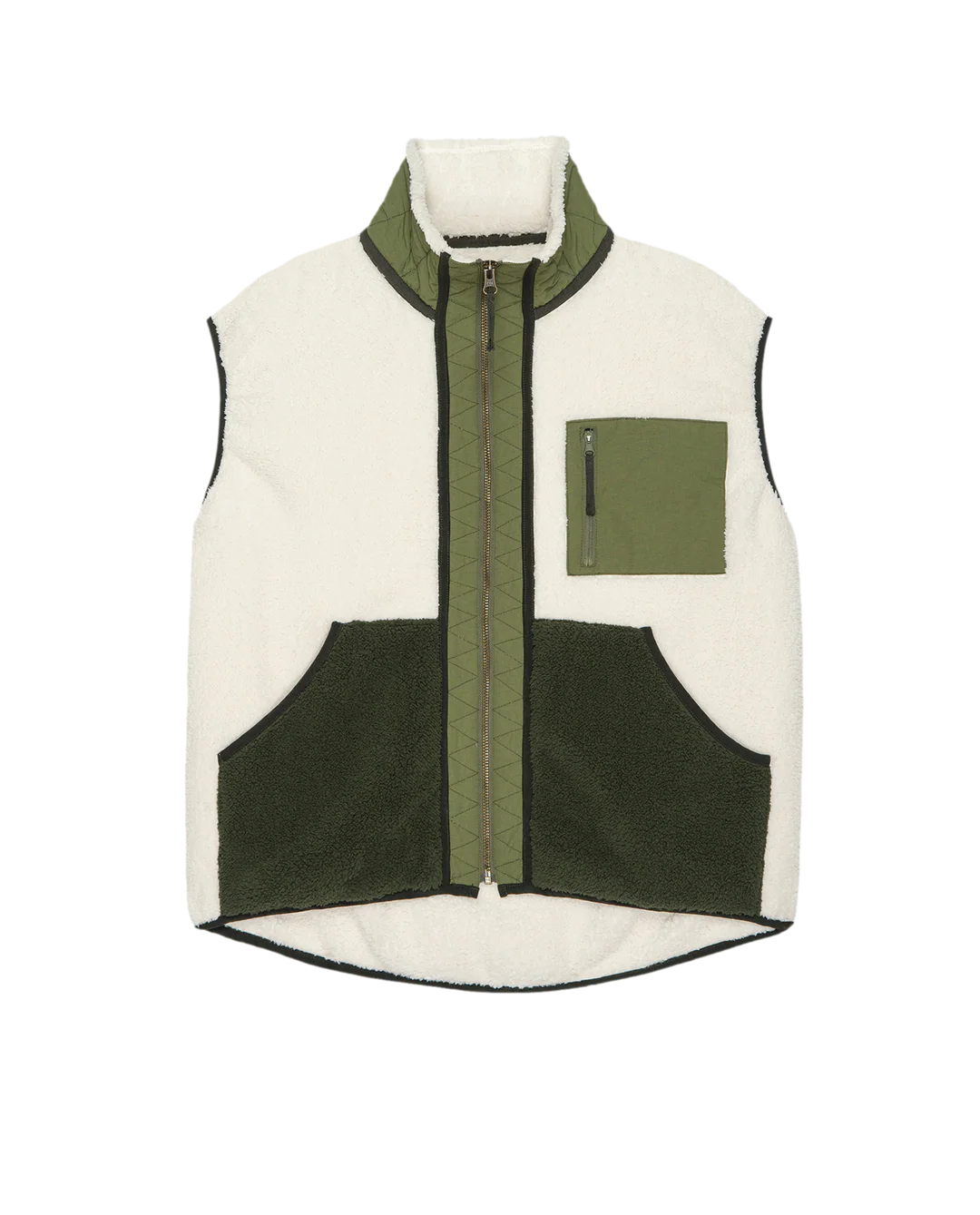 • This cozy sherpa fleece vest combines warmth, comfort, and style in one versatile layer. Featuring a cream body with olive green quilted and textured accents, it’s perfect for both outdoor adventures and everyday wear. With functional details like a zip-front closure, chest pocket, and roomy hand pockets, this vest adds a rugged yet modern touch to any outfit.